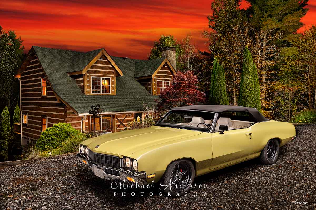 After completing the light painting photography for Grover and Teri’s 2000 Velocity Experimental Aircraft N832AB the night before, he and I headed toward the mountains of North Carolina for another cool project, a cool 1972 Buick Skylark Convertible with their pretty cabin as the backdrop!