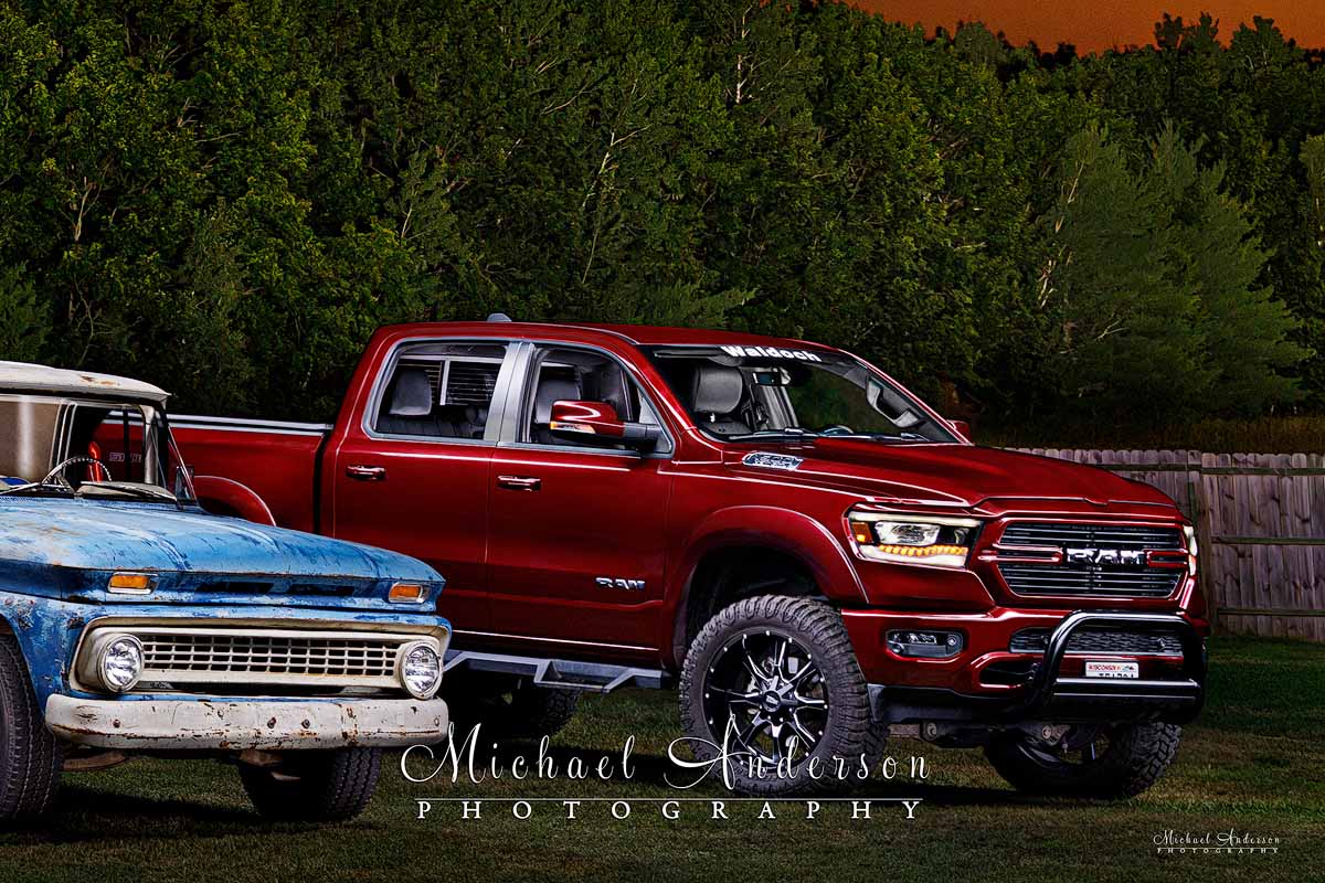 The other pickup is a 2021 Dodge Ram in Delmonico Red Pearl-Coat. It’s fitted with the Waldoch Package and was purchased brand new.