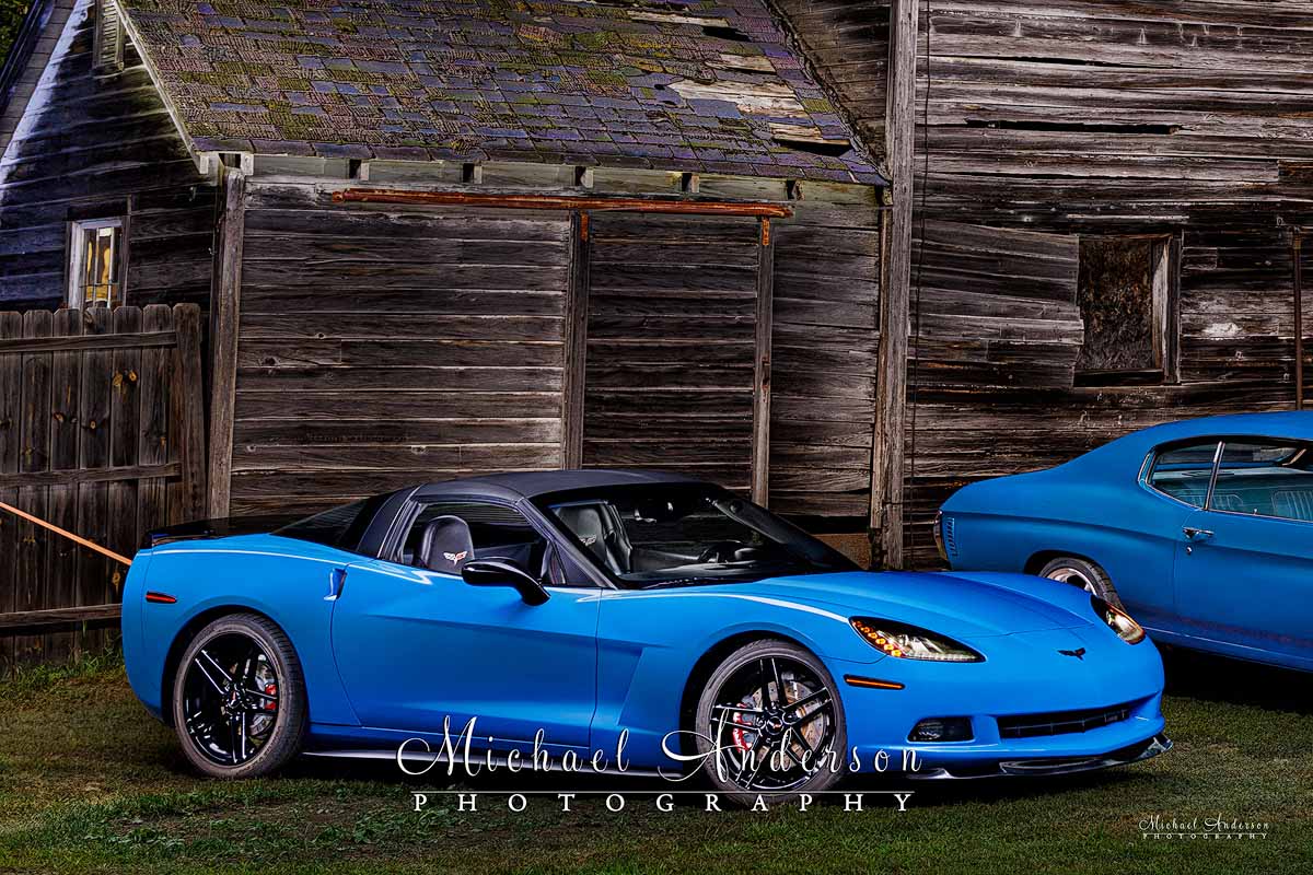 From left to right in this image, we have a 2009 C6 Corvette all wrapped in blue. Anytime that a light painting includes a Corvette, it is going to look amazing, and this image certainly does!