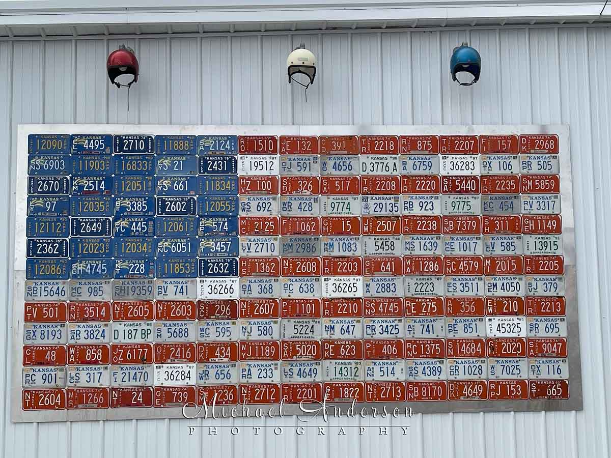 On the far left side of Aaron’s wonderful vintage Texaco Station in Galena, Kansas, there’s a large American flag created out of Kansas license plates. So cool!
