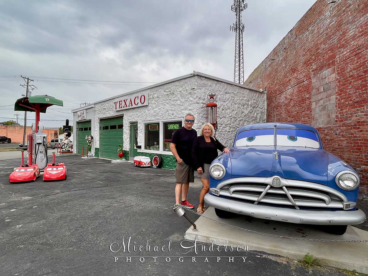 We arrived just a little before Aaron was closing up shop for the night. He was heading to an event that evening, so we could pretty much do whatever we wanted to, setup-wise. After chatting with him, I chose the angle that got all of “Big A, the Texaco Giant” in on the far left side, and “Doc Hudson”, the 1951 Hornet, from the hit Disney/Pixar film “Cars”, on the far right.