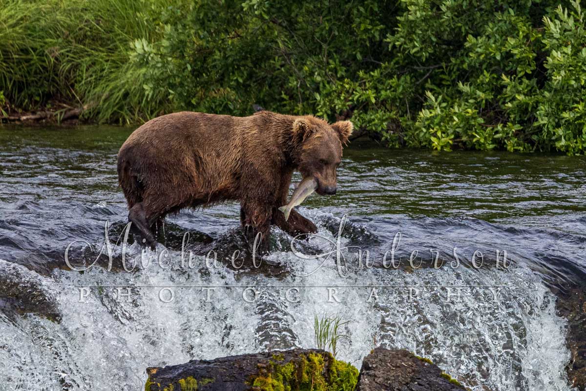 A large brown bear standing on the top of Brooks Falls with a salmon in its mouth. Photo was taken on a photography tour with Michael Anderson Photography in Katmai National Park in Alaska.