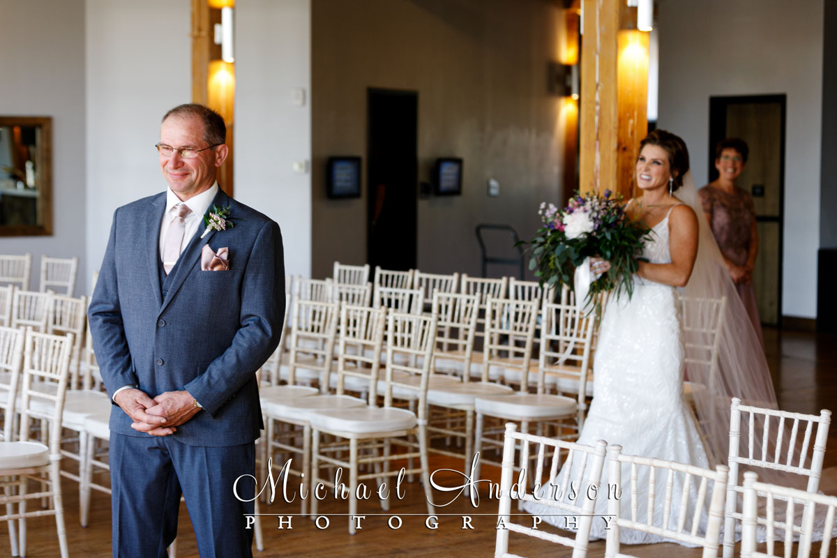 The bride's dad gets a first look at his pretty daughter at JX Event Venue in Stillwater, MN.
